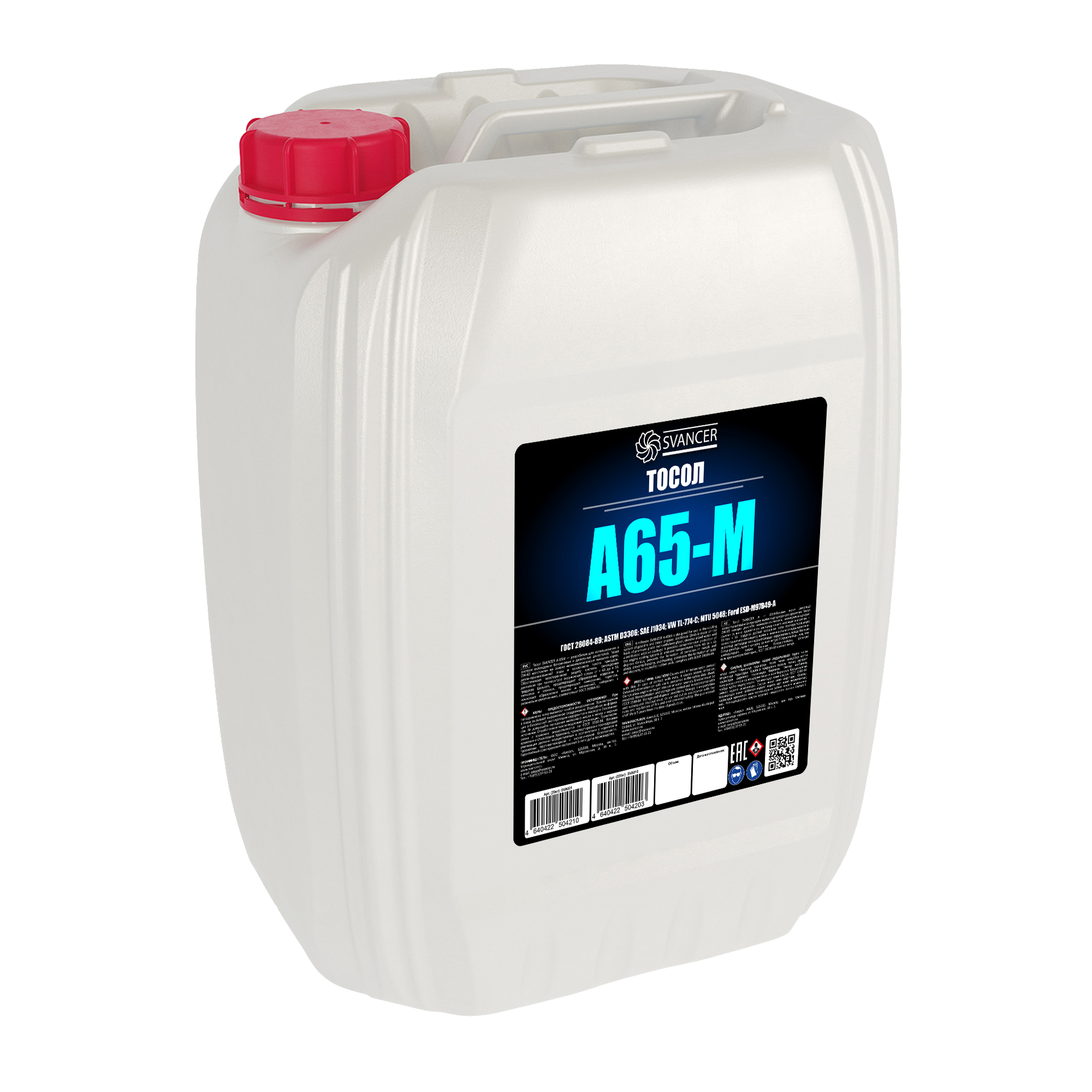 Тосол SVANCER А-65М — разработан для использования в системе охлаждения бензиновых и дизельных двигателей. Тосол ОЖ-65 изготовлен на основе моноэтиленгликоля высшего сорта, деминерализованной воды и усиленного пакета присадок. Обеспечивает всестороннюю защиту системы охлаждения двигателя при температуре окружающей среды от – 65 до + 55 градусов Цельсия, предотвращает образование коррозии в металлах и сплавах, предотвращает замерзание, перегрев, исключает образование накипи и отложений, нейтрален к резиновым уплотнениям, соответствует ГОСТ 28084-89.